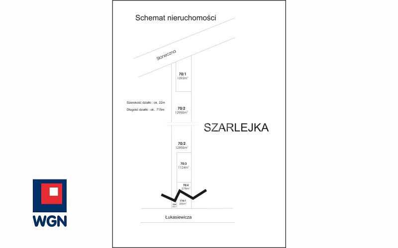 Oferujemy do sprzedaży działkę położoną w miejscowości Szarlejka k/Częstochowy, gmina Wręczyca Wielka, powiat kłobucki, województwo śląskie. Teren o powierzchni 15740 m2, oznaczony jako działki nr 70/1, 70/2, 70/3, 70/4, 176/1, 176/2. Działki znajdują się pomiędzy ulicą Łukasiewicza a ulicą Słoneczną.